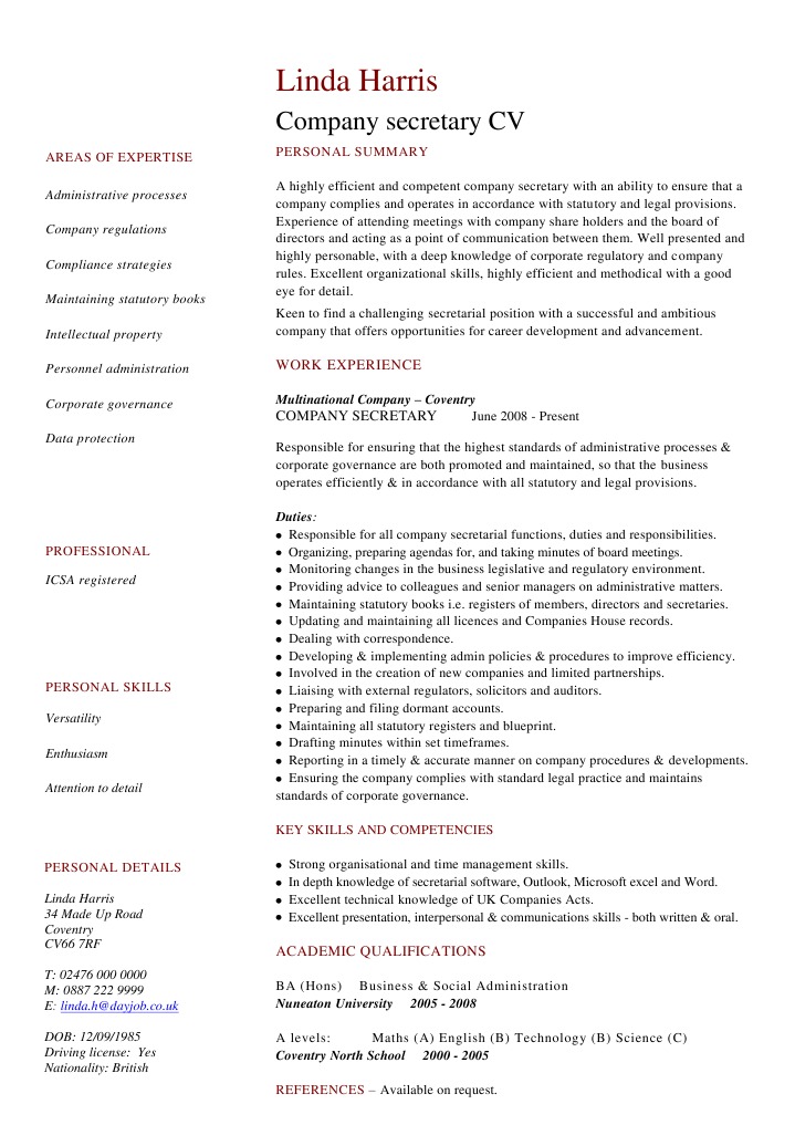 On this page you will find a link to a professionally written legal secretary cv template and also get tips on what points to focus on in your cv. A curriculum vitae (cv), latin for course of life, is a detailed professional document highlighting a person's education, experience and accomplishments. California, new york, texas, florida, and pennsylvania; Secretaries have a variety of responsibilities. Communication, scheduling, typing, collaboration, answering phone calls. Christine graham hiring manager dayjob ltd 120 vyse street birmingham b18 6nf. This is an actual cv example of a secretary who works in the secretary industry. The plethora of experience practising diplomacy and discretion while managing classified information. As a secretary, you can expect to earn a median wage of $37,870 per year, or $18.21 per hour. A person employed to handle correspondence, keep files, and do clerical work for another person or an organization. Secretarial functions such as drafting/filing the necessary legal documents for the company at corporate affairs commission detailed research for the establishment of corporate joint venture, business structure mechanisms/models for possible partners both within and outside nigeria. Having a slight edge over your competition is crucial when it comes to writing a secretary cv, and if you want to get to the interview stage you need to create a cv that outperforms the rest. Secretary at avalon health care group