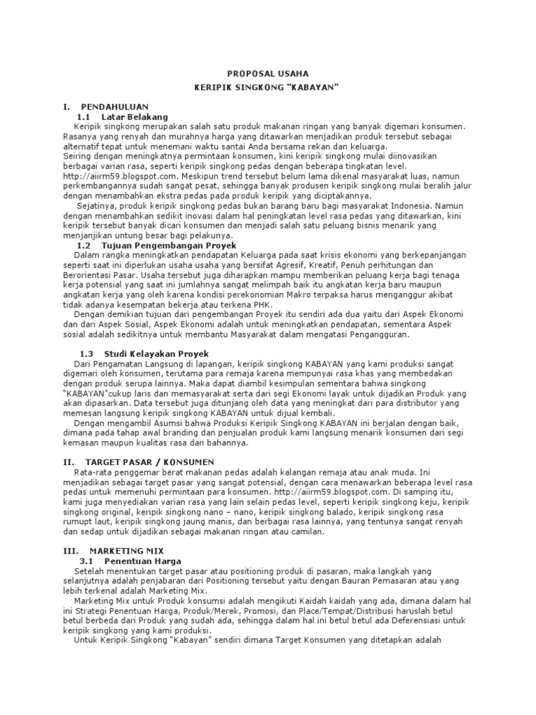 Contoh proposal keripik singkong (kwu) posted by jelajah internet , add , add comment in contoh proposal on proposal on thursday, november 06, 2014. Menggunakan bahan baku berkualitas dalam memproduksi keripik 4. Menggunakan bahan baku berrualitas dalam memproduksi keripik 3. Tanah sewa perbulan rp 520.000 biaya tempat produksi rp 5.000.000. Proposal bisnis keripik pisang dan keripik singkong bab i pendahuluan i.1 latar belakang di masa sekarang ini dimana masyarakat kita sudah sangat kritis terhadap mutu makanan yang sehat terutama makanan yang bersifat cemilan atau jajanan ringan.